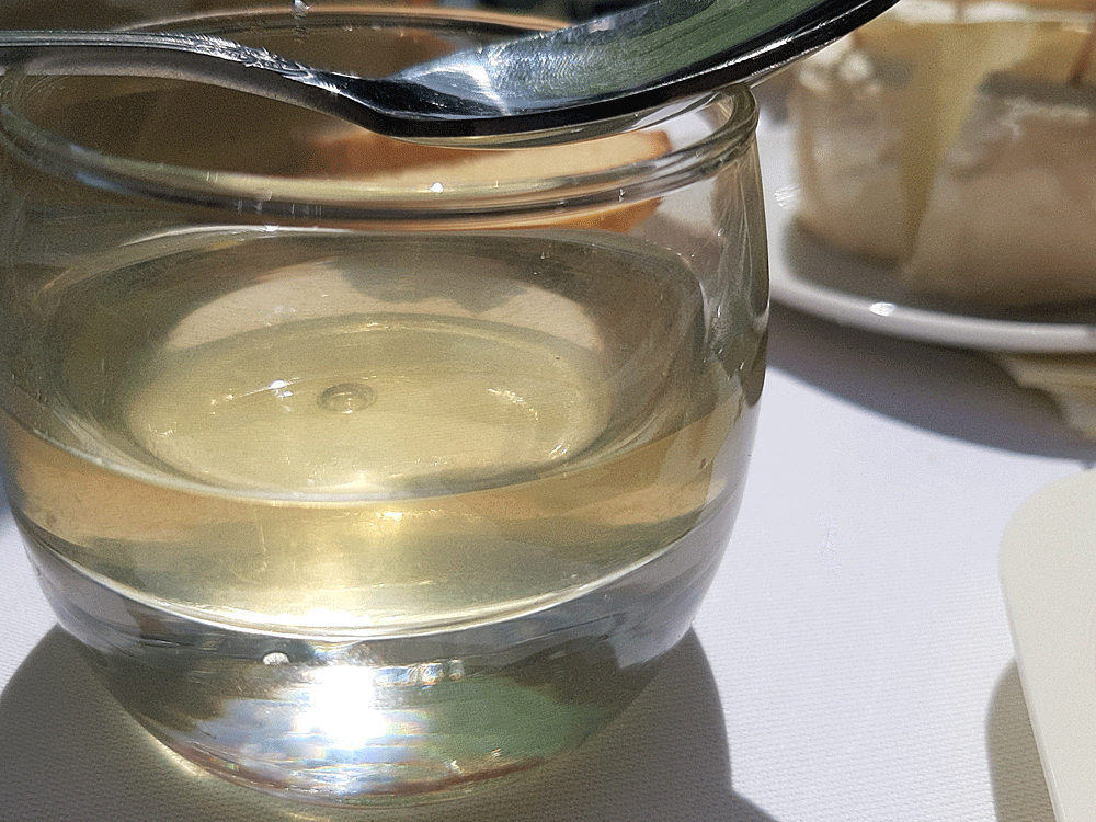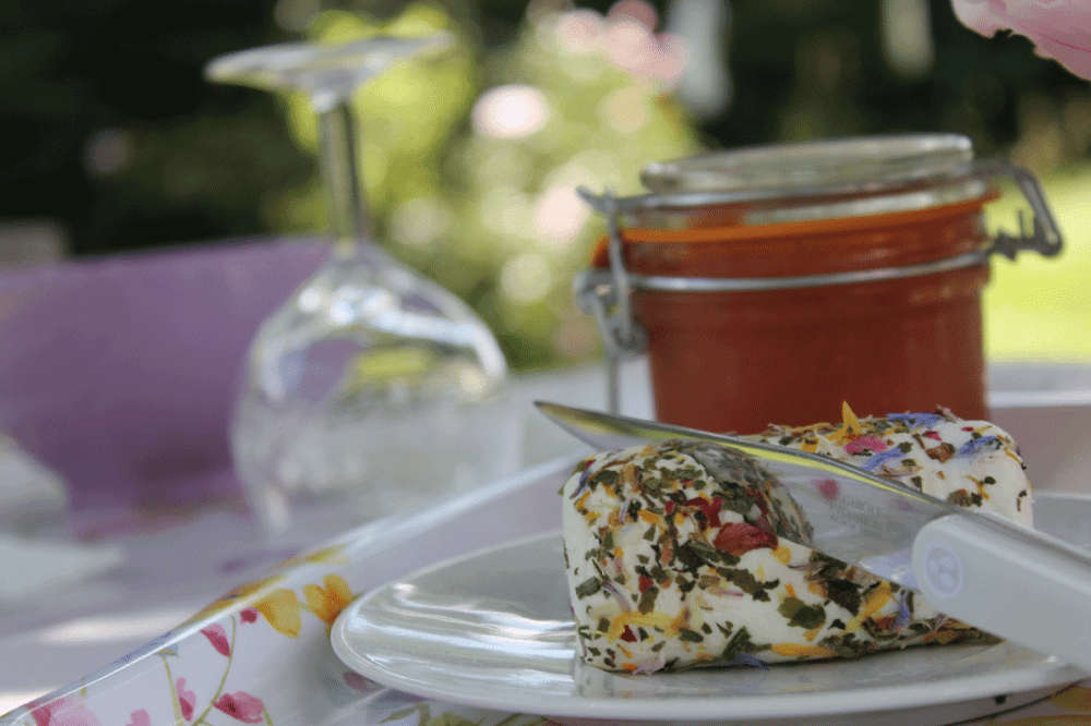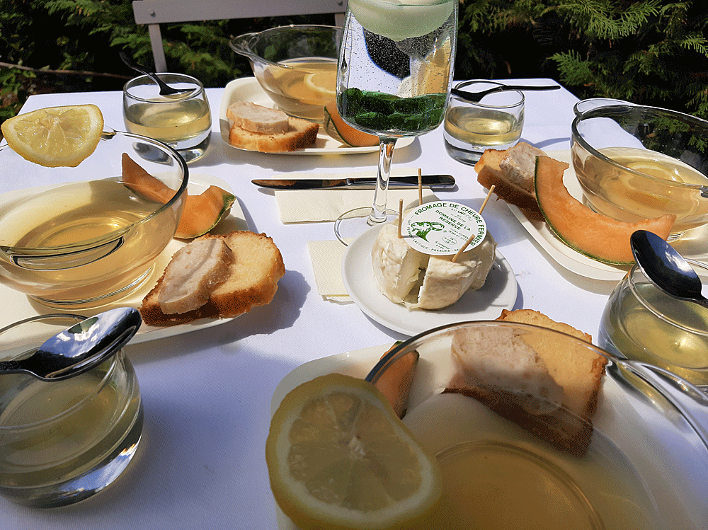 Thé bio, melon, quatre-quarts et un savoureux fromage fermier au lait cru. Gelée à la fleur de chèvrefeuille