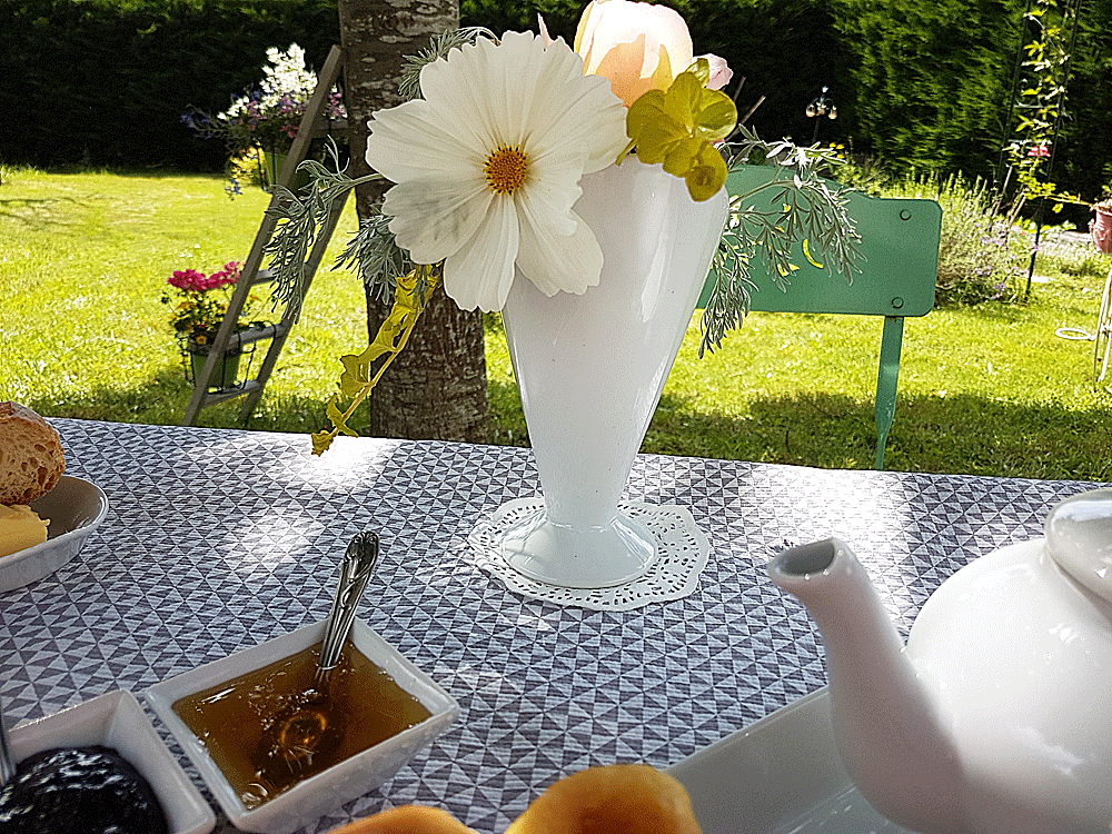 Le bonheur de commencer par un petit-déjeuner partagé et tranquille avec ses amis, qui, eux aussi, ont plein-air, les copains de rando – alors que le Soleil, à peine levé, vient nous souhaiter la bonne journée. Ce matin là, l’instant thé est idéalement accompagné de gelée de fleurs de chèvrefeuille confectionnée la veille, pour égayer encore davantage notre réunion conviviale de l’aube St-Amandoise plongeant avec délice sur le coin repas du jardin.