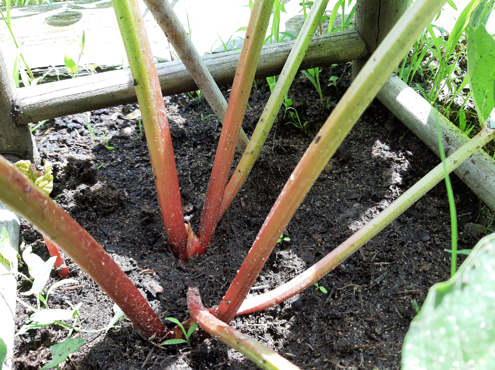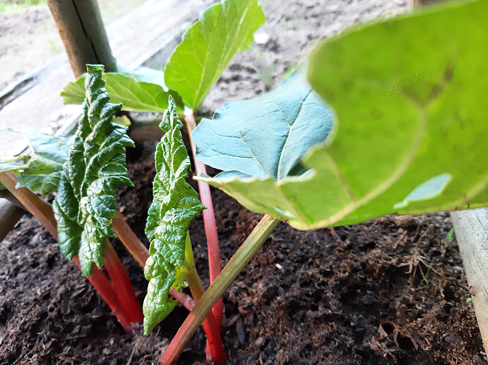 Cultivée en plein champ, la rhubarbe est d’abord une plante du Nord qui n’apprécie pas le réchauffement climatique. Au jardin sont deux beaux pieds qui ont trois printemps et font environ 1 m 26 de haut en ce moment. Leur exposition est mi ombre, pour ne pas se faire languir les larges feuilles au premiers coups de chauffe solaire. D’abord semés par graines bio, ils mirent un assez long temps avant de pouvoir les installer à 4 feuilles directement en terre. Pas mécontente des essais !