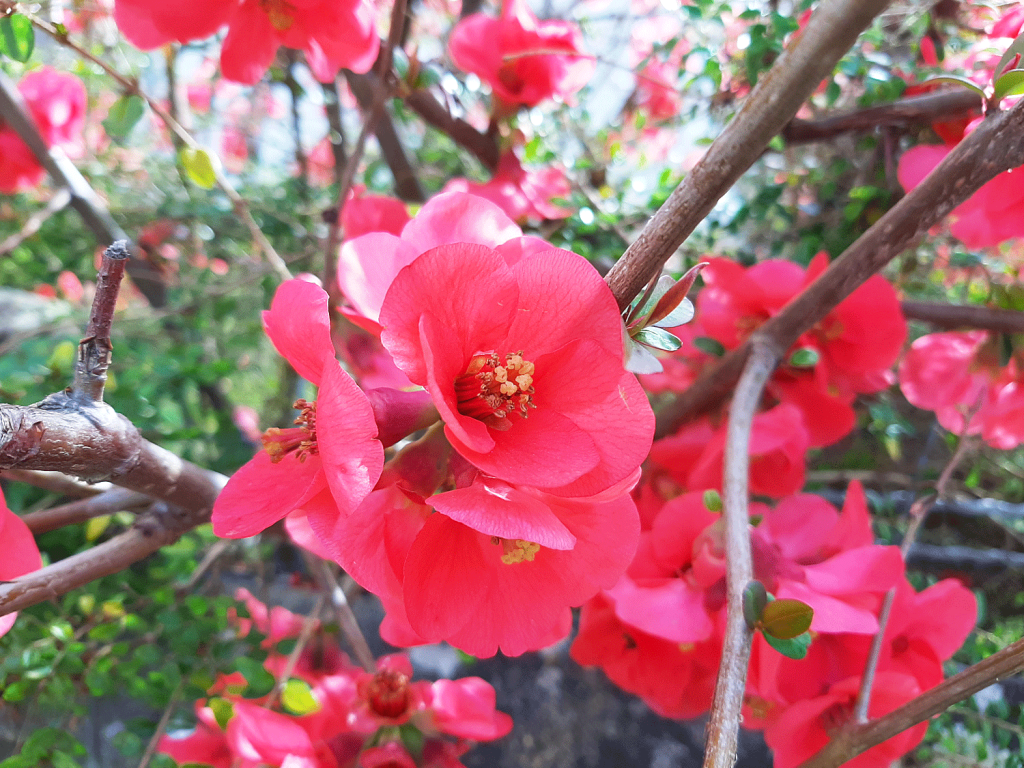 Que « Mars » voit rouge, rien de bien surprenant en terme de réflexion faisant son chemin, quant on est planète de feu dans notre système solaire. En allant au jardin un peu plus en matinée lors de la semaine du 15 au 22 février, j’avais bien remarquée la nature s’éveillant bien avant la son cycle de floraison habituel. Au jardin, plusieurs arbustes sont déjà couverts de fleurs, tel ci-dessous le Cognassier du Japon… D’une magnifique floraison !