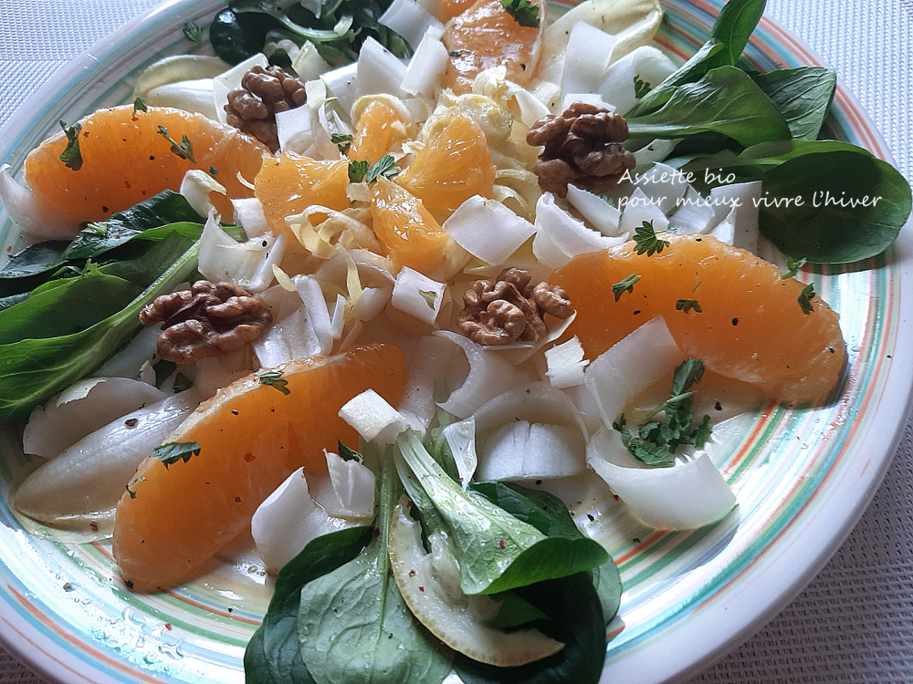 Aujourd’hui, c’est un duo de salades que j’ai préparé, une assiette bio qui vit bien l’hiver.