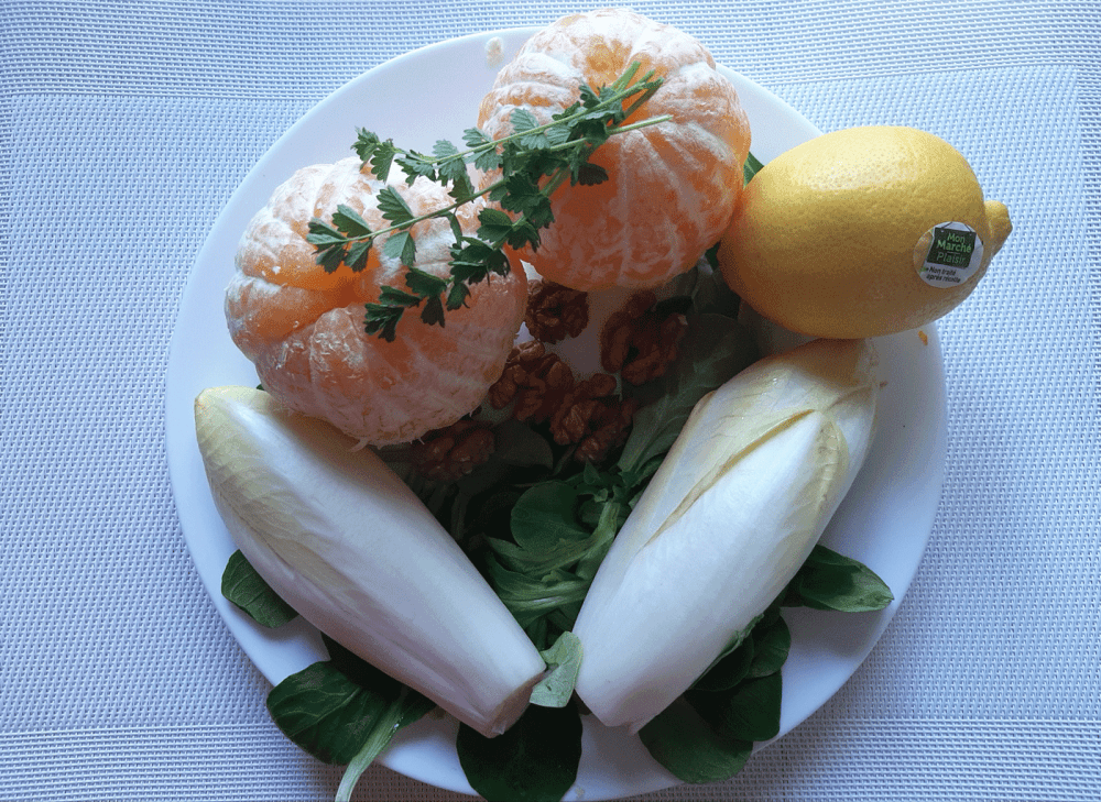 L’endive, la mâche (chez moi en Berry, c’est une doucette) et l’orange pour agrume en plein cœur de janvier. Je ne cultive pas l’endive mais la mâche et la pimprenelle proviennent du jardin. Bien abrités des gelées blanches matinales, ce matin je suis allé couper quelques pieds de mâche pendant qu’ils voyaient un peu le soleil, et brins de pimprenelle délicieuse dans les salades… Pour une assiette composée en un rien de temps (10 minutes) et délicieuse !
