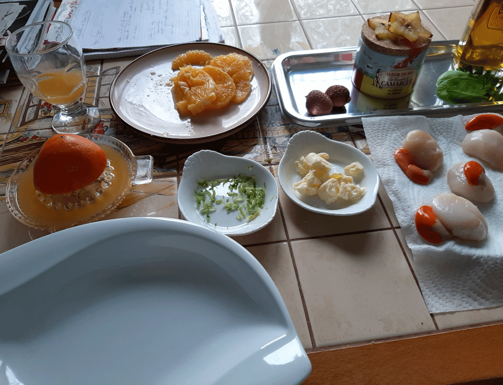 Vous pouvez réaliser cette assiette à Noël, simple et rapidement préparée. Les noix de Saint-Jacques sont ici snackées, blondies dans une poêle bien chaude avec un peux de beurre associé à de l’huile d’olive. Les noix sont alors à dorer pas plus de 3 à 4 minutes sur chaque face. Je vous les propose fruitées par ajout de quelques étoiles de carambole, rondelles et jus d’une orange pressée, zeste de citron vert. Et pour ce qui est du corail, je le laisse, pour s’en régaler de même !