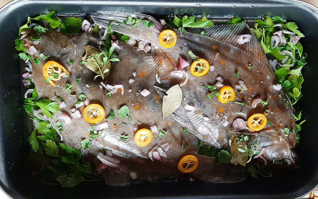 2. Je tapisse le fond avec le persil et les échalotes émincées, puis j’y place les carrelets. Je les recouvre de kimkats coupés en rondelles, et à nouveau d’un peu de persil et d’échalotes, d’un second filet d’huile et de feuilles de laurier. Saler, poivrer.