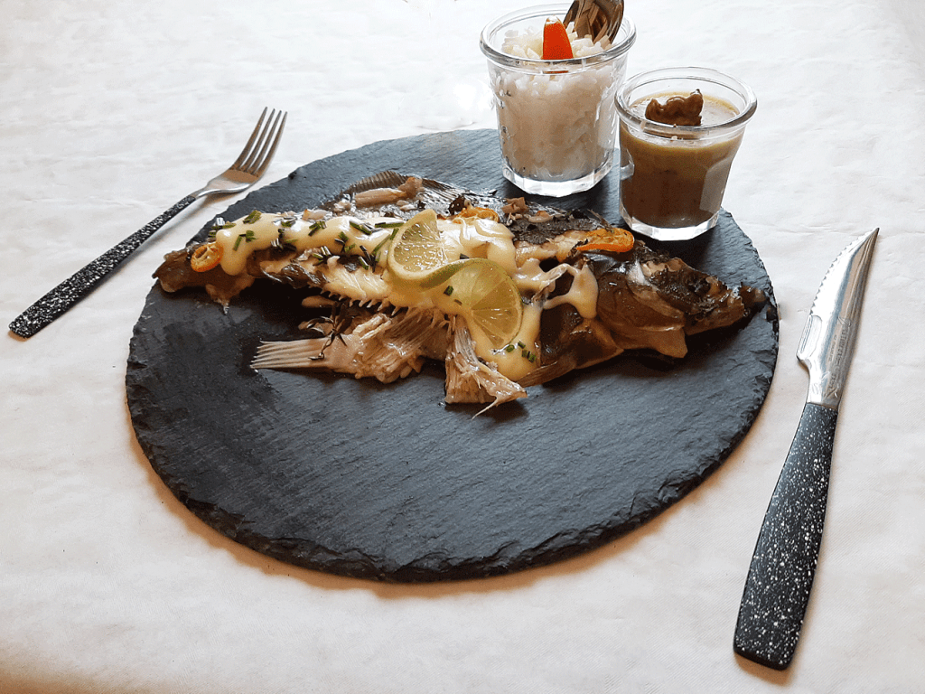 4. Après cuisson, sortir du four. Je place une spatule sous chacun des poisson pour les transférer jusqu’à l’assiette (ici en ardoise). J’essaie d’en déchirer le moins possible mais ce n’est pas toujours évidant, tant la peu et la chair sont fines. Quoi qu’il en soit, on fait selon.