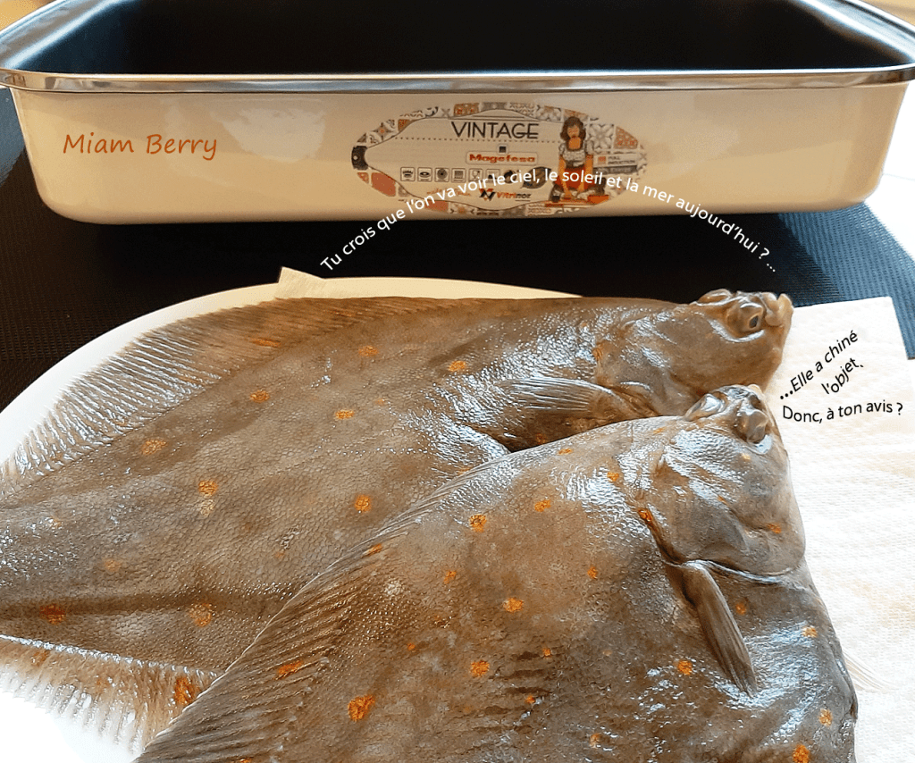 Ces deux-ci extra frais et de belle taille, préparés pour être cuits au four (préchauffé). J’aime beaucoup ce poisson pour sa chair très fine. Les aromates de mon jardin), cueillis juste quelques minutes avant la préparation, vont répandre une délicieuse cuisson très parfumée.