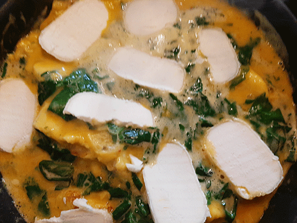 C’est une omelette délicieusement parfumée des saveurs du printemps et du terroir du Berry, une omelette fondante faite avec deux beaux œufs bio (deux œufs suffisent par omelette individuelle), deux Crottin de Chavignol, quelques petites asperges poêlées, quelques feuilles d’épinard et des herbes fraîches du jardin. C’est un régal !