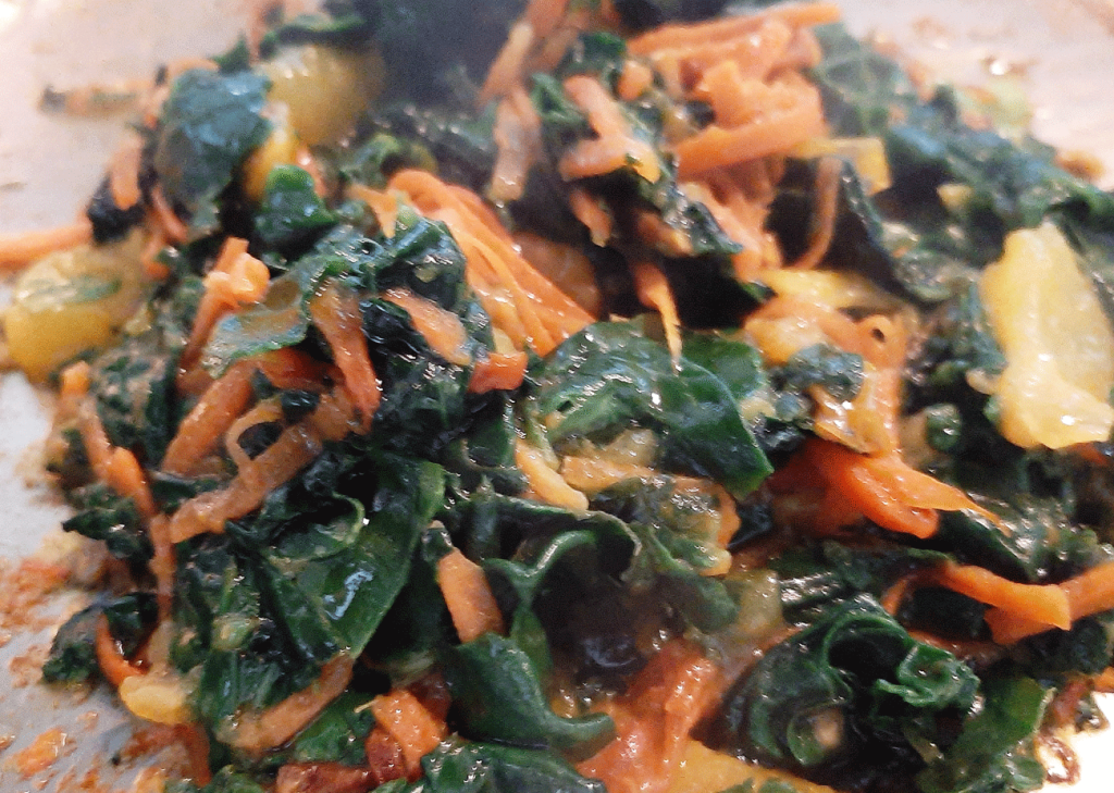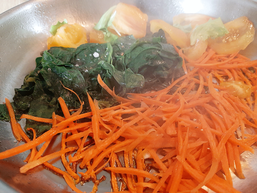 Pendant ce temps, j’ai préparé à part les légumes à la poêle, avec un filet d’huile d’olive bio.