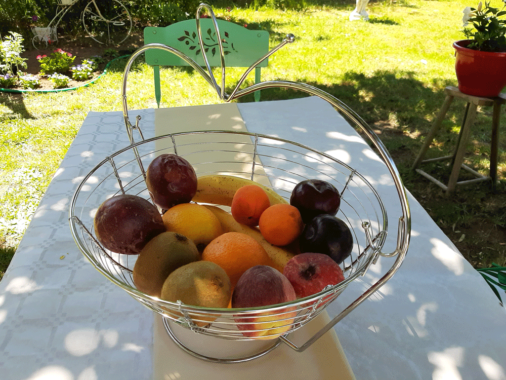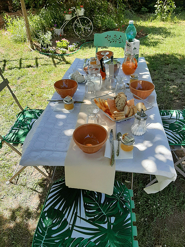 Quoi qu’il en soit, les fruits de saison terminent joyeusement le petit-déjeuner accompagné par les chants d’oiseaux , au vert eux aussi.