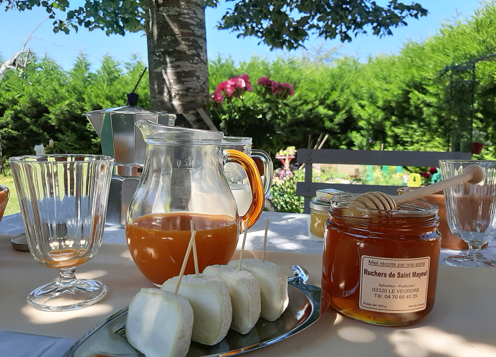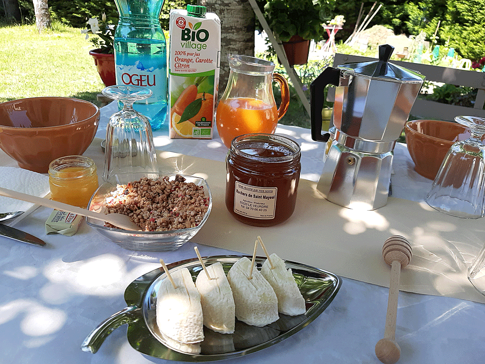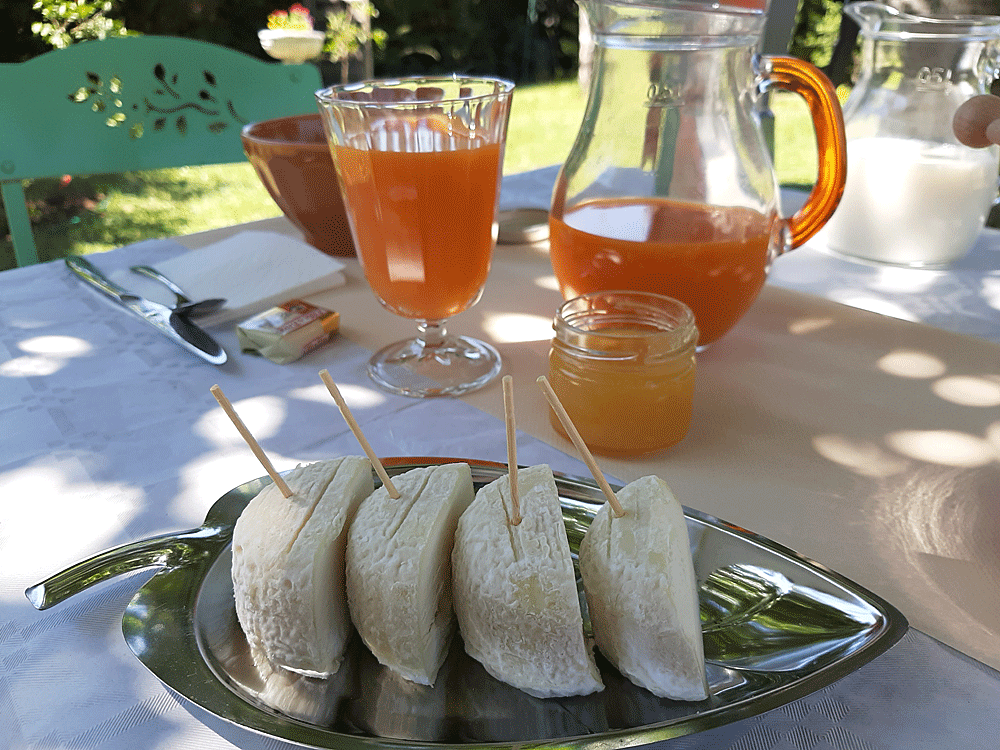 De bons jus de fruits frais gorgés de Soleil au matin, un bien à se faire, même s’ils n’ont pas été pressés « maison ». Puis une fois n’étant pas coutume, notre bon petit fromage AOP berrichon, aux formes rondes et chaleureuses s’invitait volontiers à nos papilles : délicieux Crottin de Chavignol !