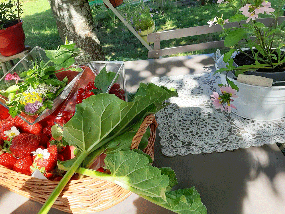 Petits-pois bio, fleur de sauge, persil, fines herbes, tige de curry en fleurs, groseilles, fraises » Maxim » plantés ce printemps – très sucrées (plein développement), puis quelques tiges fines de rhubarbe pour une gourmandise prochaine.