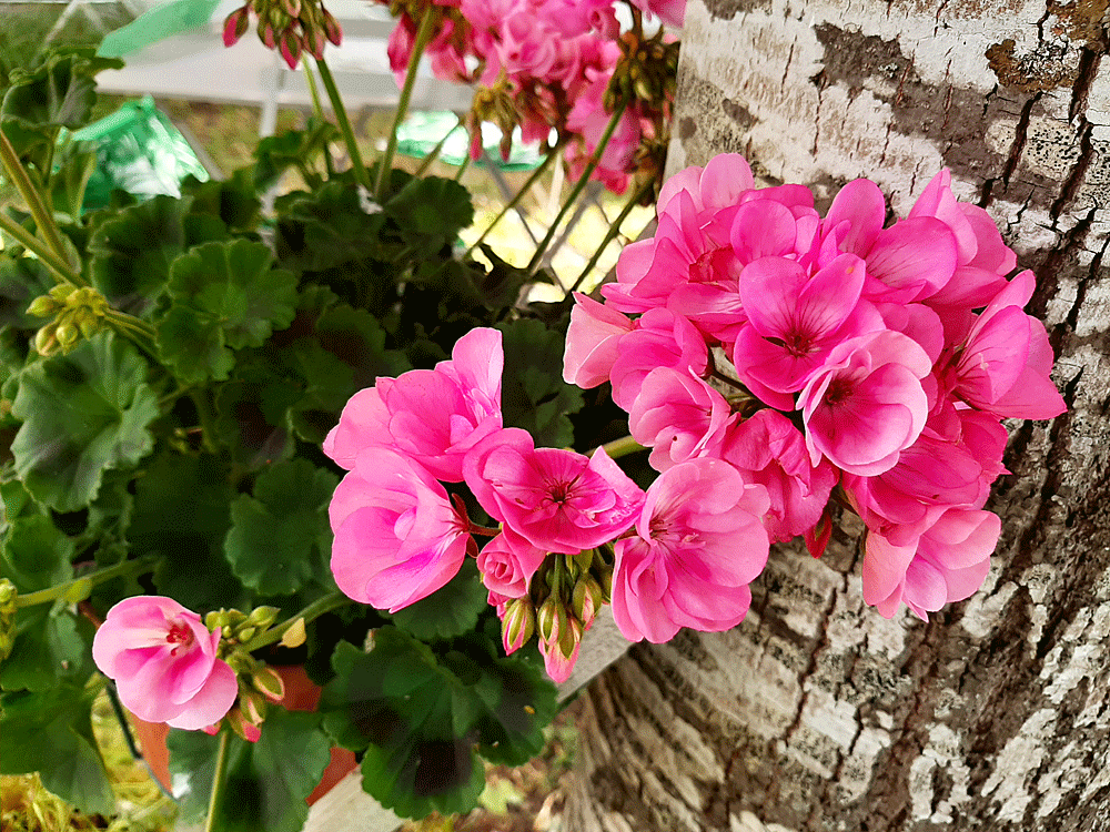 Géranium rose vif, habillant la base d’un tilleul argenté.