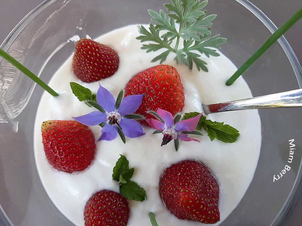 Il est 10 h, aussi je pense à me faire plaisir en allant à la cuisine chercher une verrine, dans laquelle je mets un bon fromage blanc fermier. Puis je retourne au jardin ramasser quelques fraises, une feuille d’absinthe, fleurs de bourrache, feuilles de menthe et fines herbes.