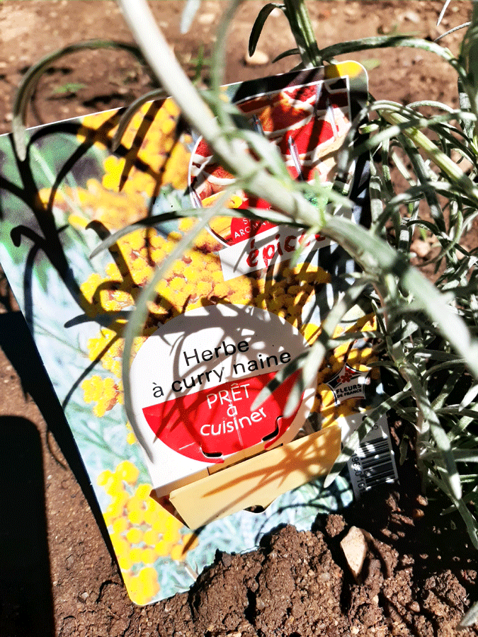 Elle s’appelle ainsi car lorsqu’on froisse entre les mains ses tiges et feuilles, s’en dégage le réel parfum qui fait penser au curry. Testé pour vous. C’est un arbrissaut vivace, condimentaire qu’il faut absolument sentir si vous le croisez, ou bien le tenez entre les mains. Celle-ci est naine. Je l’ai cru avoir rendu l’âme au tout début du printemps, en fait non. Comme toute vivace, elle n’était pas encore pête pour un retour. La revoici pour une 2° année. d’ici quelques selmaines, le petit buissonnant devrait commencer à embaume l’air ambiant de ses odeurs de curry. Voilà d’ailleurs pourquoi son nom d’herbe à curry n’est pas usurpé !