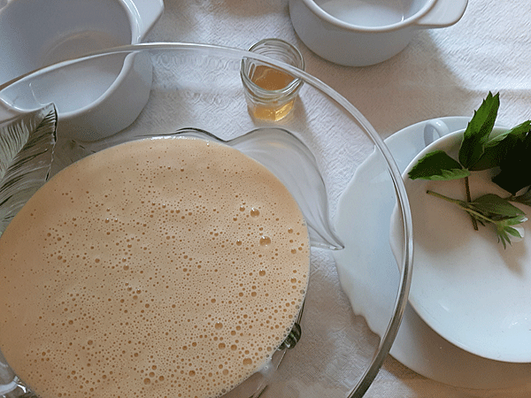 Préchauffer le four à 180 °C. Fouetter les œufs au batteur jusqu’à ce qu’ils doublent de volume. Ajouter la farine en pluie et le sel en fouettant jusqu’à ce qu’il n’y ait plus de grumeaux. Incorporer le lait et la liqueur d’amandes.