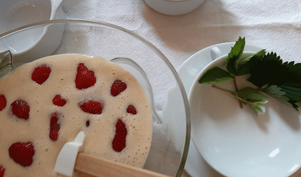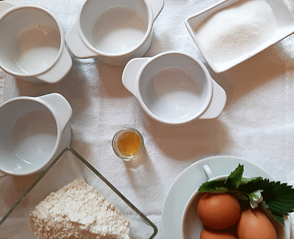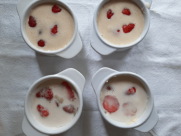 Et puis arrive l’instant d’une douceur qui conclue un repas ou bien s’invite au goûter. L’incontournable petit clafouti aux fruits de saison, que l’on aime ainsi : fraises-rhubarbe, une savoureuse association dont la saveur de l’un révèle celle de l’autre telles deux inséparables. Pour cela, je fis bonne réserve quelques minutes avant la réalisation de 4 petits clafoutis.