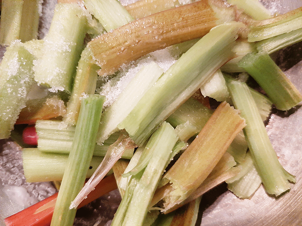 Peler la rhubarbe, l’émincer et la mettre dans une casserole avec le sucre, puis faire chauffer à feu vif. Laisser cuire une quinzaine de minutes puis retirer du feu.