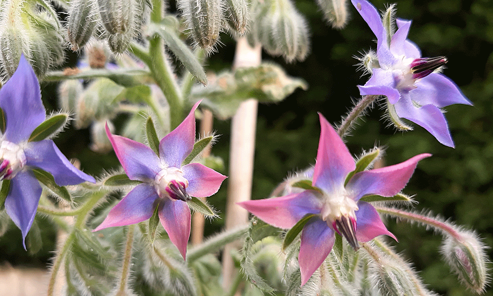 J’aime beaucoup les petites fleurs de bourrache dans des ses deux couleurs tendres qui font si naturelles dans un jardin et qui attirent les abeilles. Pour moi c’est une fleur à classer dans les aromatiques. Elle est pleine de gaieté avec ses petites fleurs en étoiles, je l’aime beaucoup !