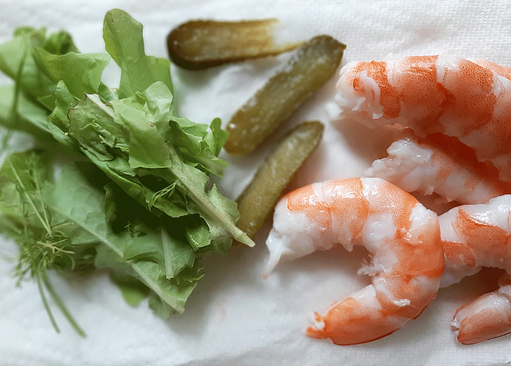 le trancher en deux et poser les deux parts bien au centre. Répartir 3 crevettes (par pain).