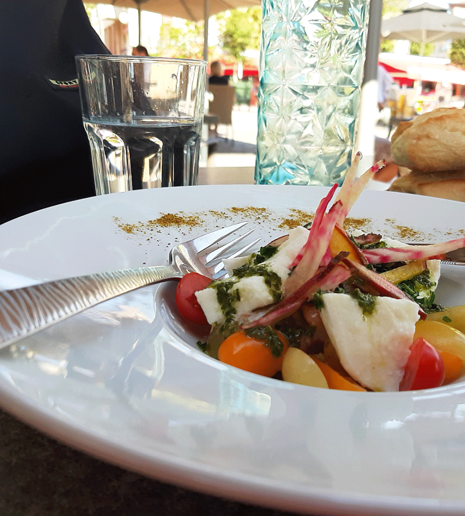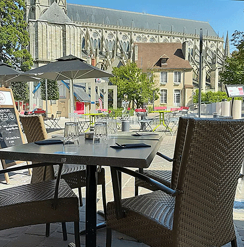 Je suis probablement passée des centaines de fois par ici, longeant le restaurant, et cependant, je ne m’y étais jamais pausée pour y déjeuner ou dîner. Il m’a fallut attendre la période estivale 2020 pour y aller. Peut-être faut-il y voir un signe, quand on jette son dévolu sur ce restaurant couvé du regard par la Cathédrale Saint-Étienne. Oui, je sais bien, ceux qui me connaissent disent que je vois des signes partout !…