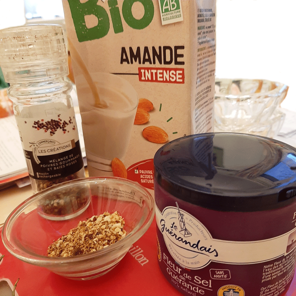 La semaine passée, nous avons partagé un délicieux velouté de fromage de brebis aux noisettes, que j’ai réalisé pour 4 gourmand(e)s. Sa préparation m’a pris 20 min, dont 5 mn pour le cuir et 2 h d’attente au réfrigérateur. En fait, c’est un velouté froid qui peut être servi comme hors-d’œuvre au dîner.