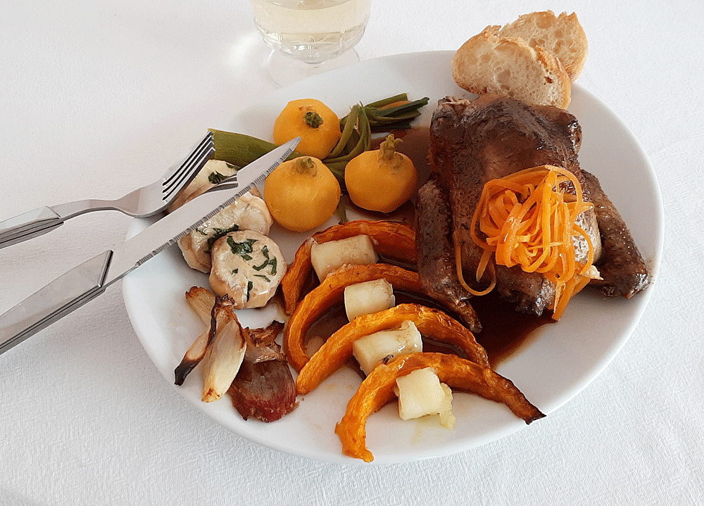 Dans chacune des assiettes, le pigeon, une viande, puis 1/2 poireau en fond, 3 navets, 4 tranches de potimarron ente lesquelles sont des rondins de pomme-de-terre que j’ai emporte-piècés, puis de l’autre côté, 3 champignons et l’échalotte braisée terminant l’assiette.