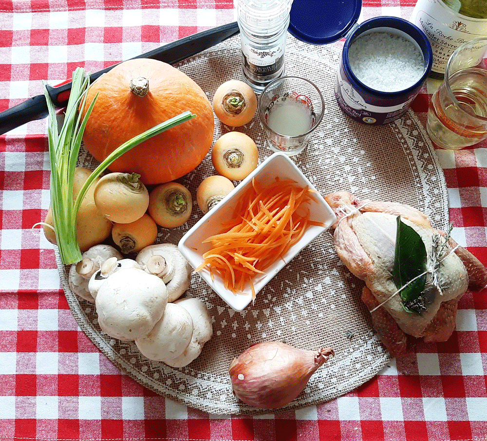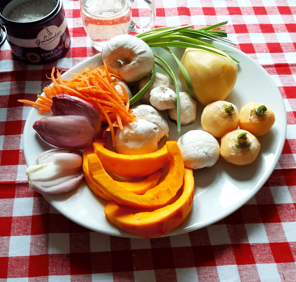 Potimarron, navet, champignon, carotte émincée en julienne, pomme-de-terre, poireau, échalotte braisée au four, sont d’excellents copains entre eux, et quelles saveurs associées pour régaler autour d’un pigeon !