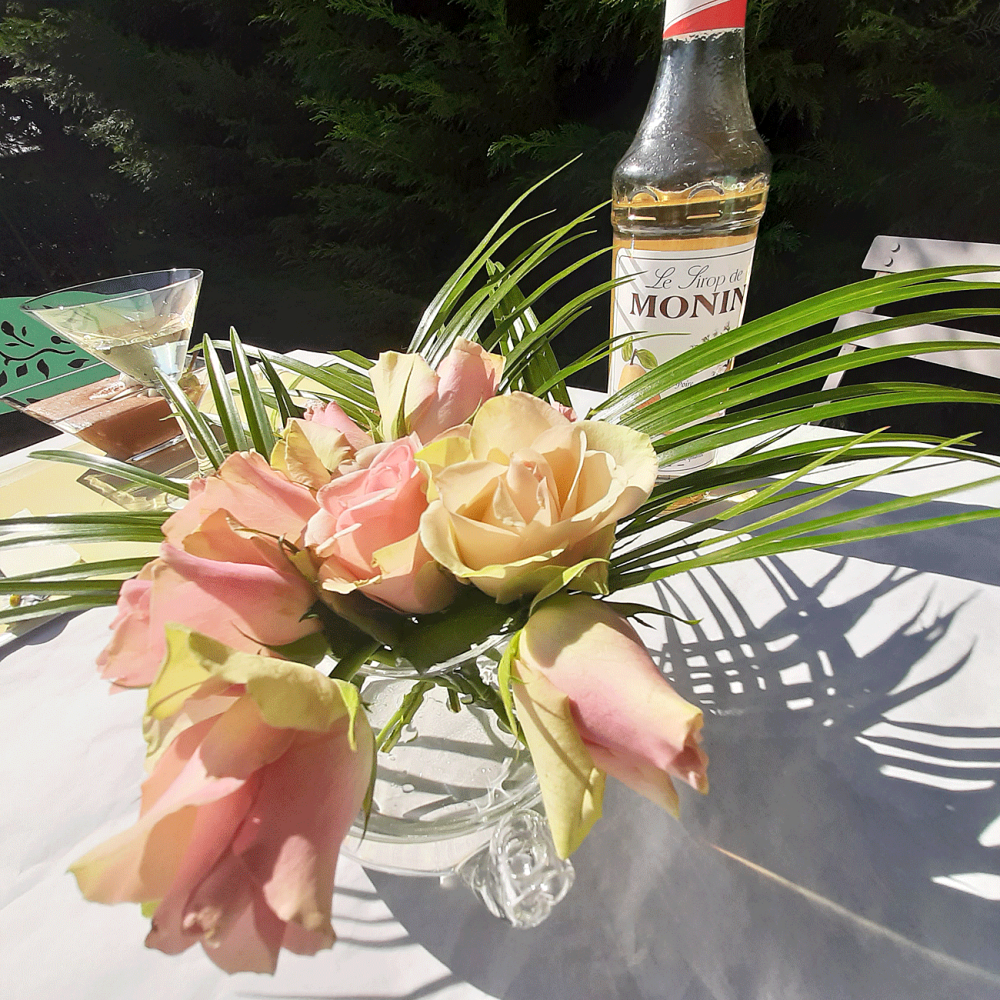 Un bref passage par ici pour vous partager le petit verre de sirop de rose dont je viens de me délecter, après 1 h de jardinage + la 1ère tonte (j’ai omis de demander à la Lune) de saison.