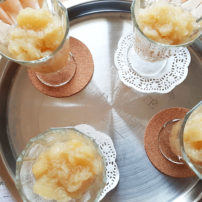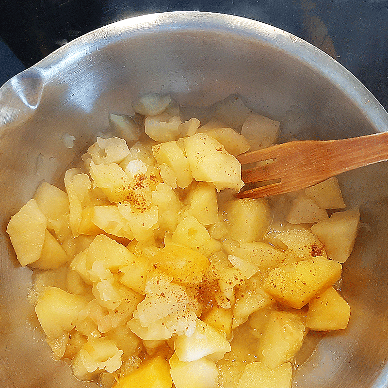 Un écrasé de pommes sucrées auxquelles il n’est pas toujours nécessaires d’ajouter du sucre. Bien cuites au naturel, elles ne sont que délice ! J’ai ajouté de la cannelle en poudre à mi-cuisson.