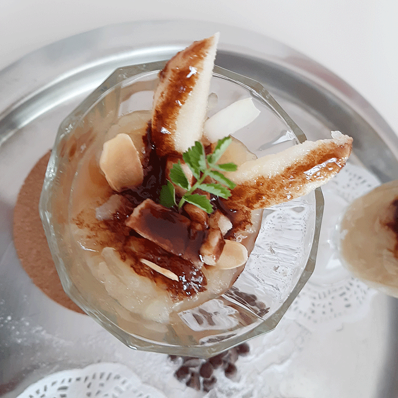 Retirer du feu, écraser les pommes à la fourchette pour obtenir non pas une compote lisse mais un écrasé. En remplir les verrines / coupelles. Laisser tiédir. Pndant ce temps, toréfier quelques amandes dans une petite poêle, sur feu vif, quelques secondes seulement. Couler au centre 1 c. à soupe de chocolat pour chacune des verrines. Saupoudrer d’amandes grillées, puis terminer par un petit brin de menthe fraîche, ou bien de pimprenelle.
