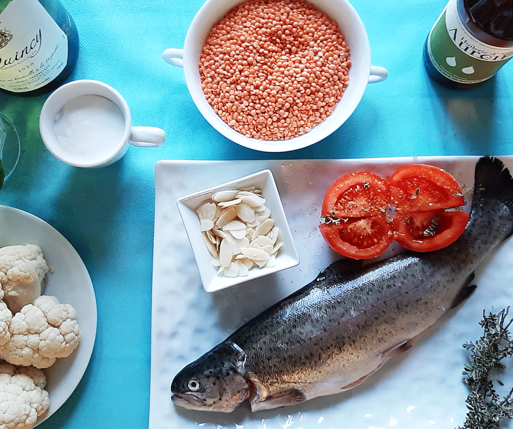 Truites aux amandes & blanc Quincy : lentilles corail, chou-fleur