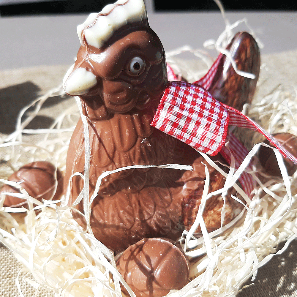 6 gros oeufs prâlinés se trouvent à l’extérieur. Dans le ventre de la poule est la friture qui attend aussi bien petits et grands. Le chocolat est assez fin et d’arôme gouteux. Un assotiment également, autour de Pâques : friture, sachets d’oeufs dans les papiers colorés, les petits oeufs de couleurs, en sucre.