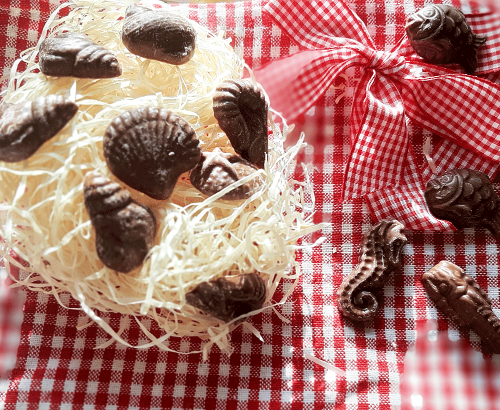 Aujourd’hui, c’est autour de la poule enrubannée qui s’est invitée. Elle est accompagnée de petits sujets connotés ïode & embruns, selon la tradition des saveurs Pascales.
