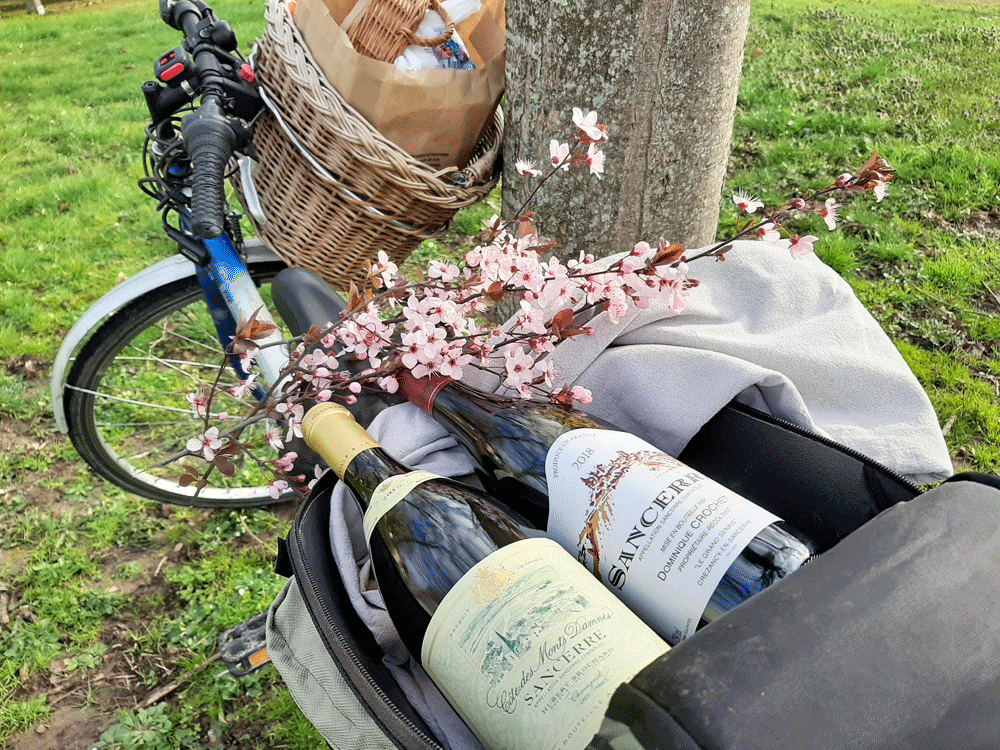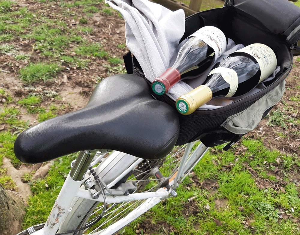Préparé dès le petit-déjeuner sonné, le vélo est chargé. C’est fou, tout ce que je peux lui faire contenir, via le panier embarqué et le porte-bagage grands crus, tel ci-contre. L’abus d’alcool est dangereux pour la santé. À consommer avec modération.