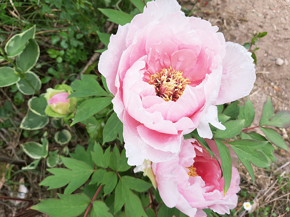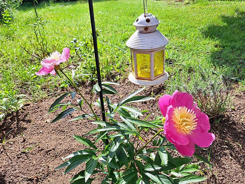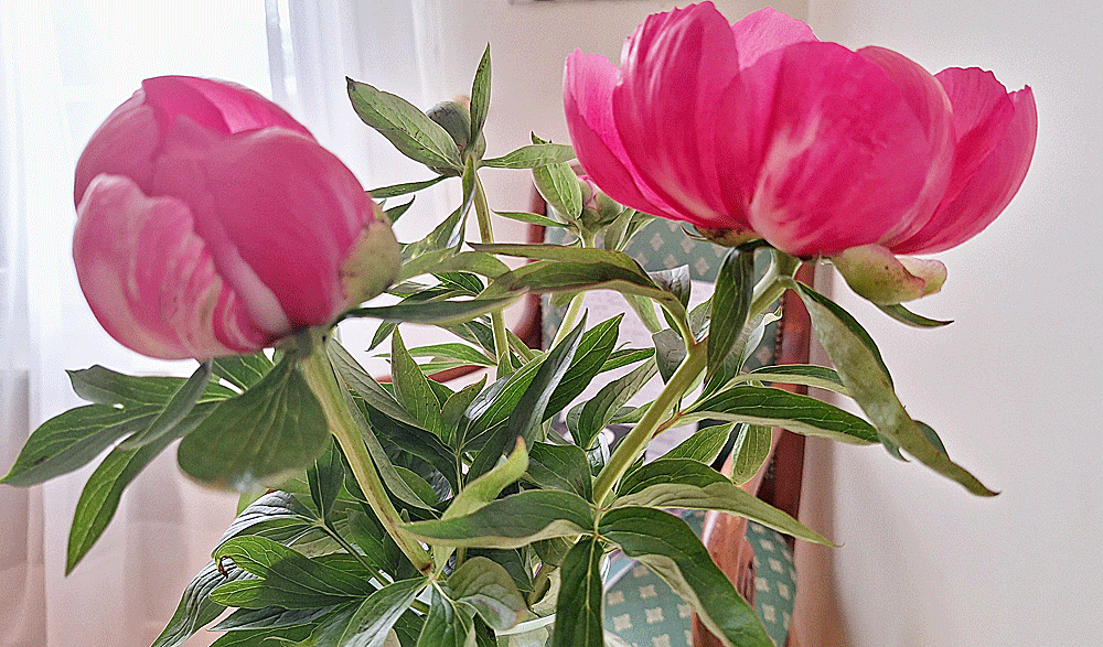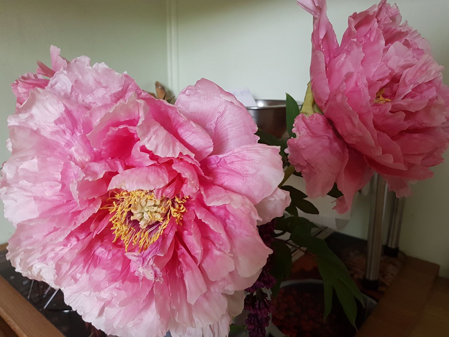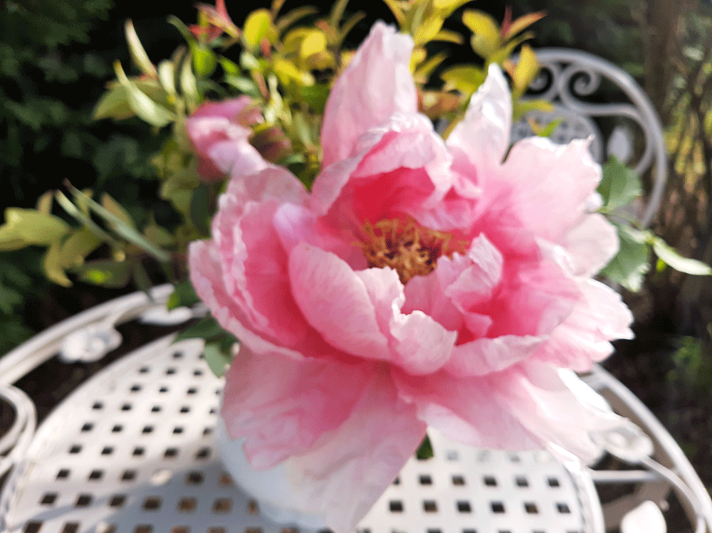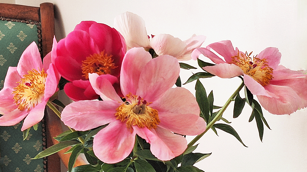 Deux pivoines dites « simples » ou de jardin, pour lesquelles j’ai encore succombé. Par passion pour les pivoines que je partage avec beaucoup d’amis et de connaissances qui, eux aussi, ont la pivoine dans le cœur – voire même avant la rose.