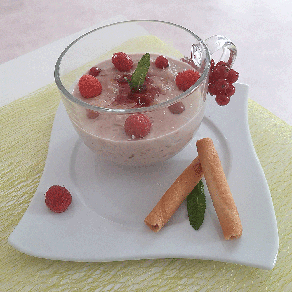 4. Répartir dans des bols ou coupes, en décorant de frambises et groseilles restantes.