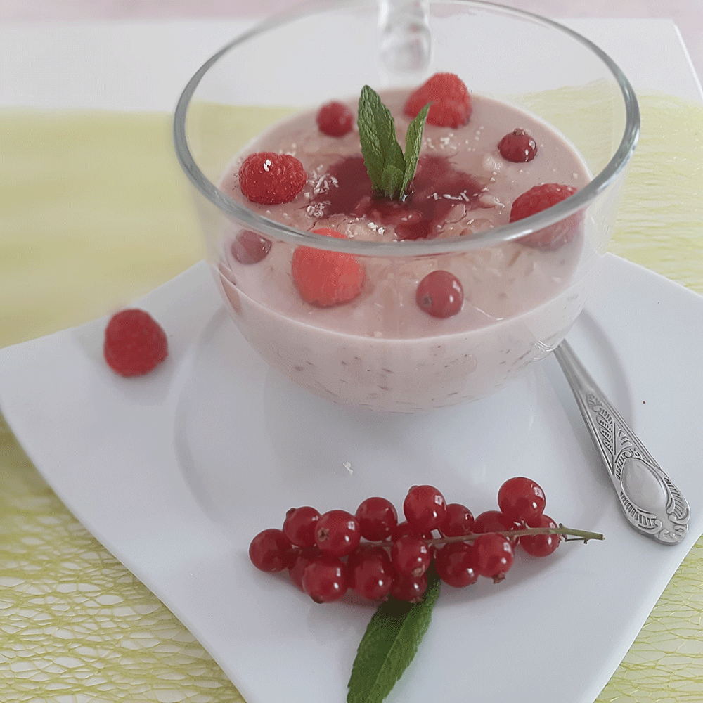 Vous aimez le chocolat blanc, les framboises, les groseilles et le risotto parfumé d’une pincée de piment d’Espelette ? En ce cas, régalez-vous de ce mets rosé ! Un risotto bio au chocolat blanc et fruits rouges, auquel j’ai ajouté un coulis de framboises, et quelques feuilles de menthe du jardin pour la touche finale. En duo ou pour 4 personnes, un p’tit dessert extra aux parfums juste délicieux !