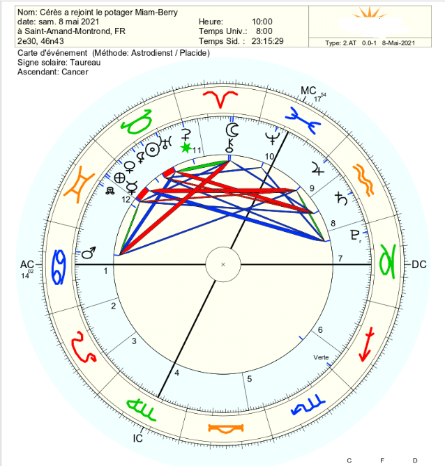 1° : Du point de vue astrologique : vous voyez sur la carte, le glyphe représenté par un « C » inversé, terminé par une croix ? Voici « Cérès ». Pour mieux distinguer, j’ai mis une étoile verte dessous.