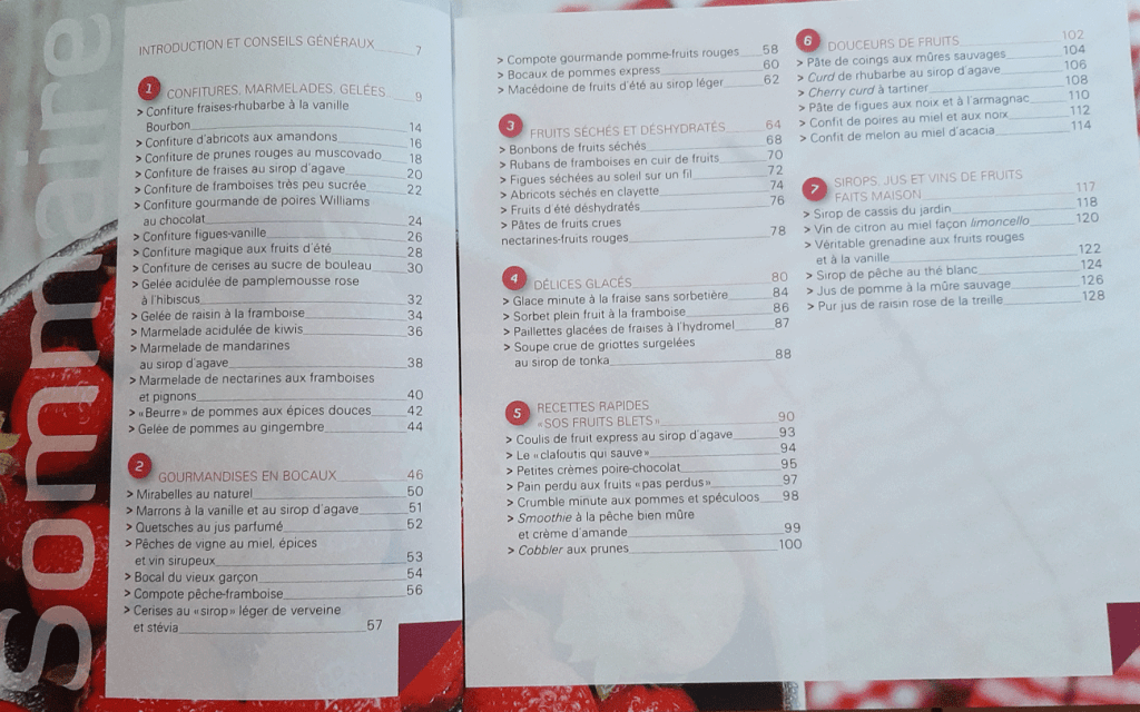 Les autres chapitres sont consacrés aux recettes et elles sont aussi généreuses que nombreuses : coulis, sirops, jus, vins de fruits, confits, pâtes de fruits, cobblers, crumbls minute, délices glacés (sorbets, glaçons)…