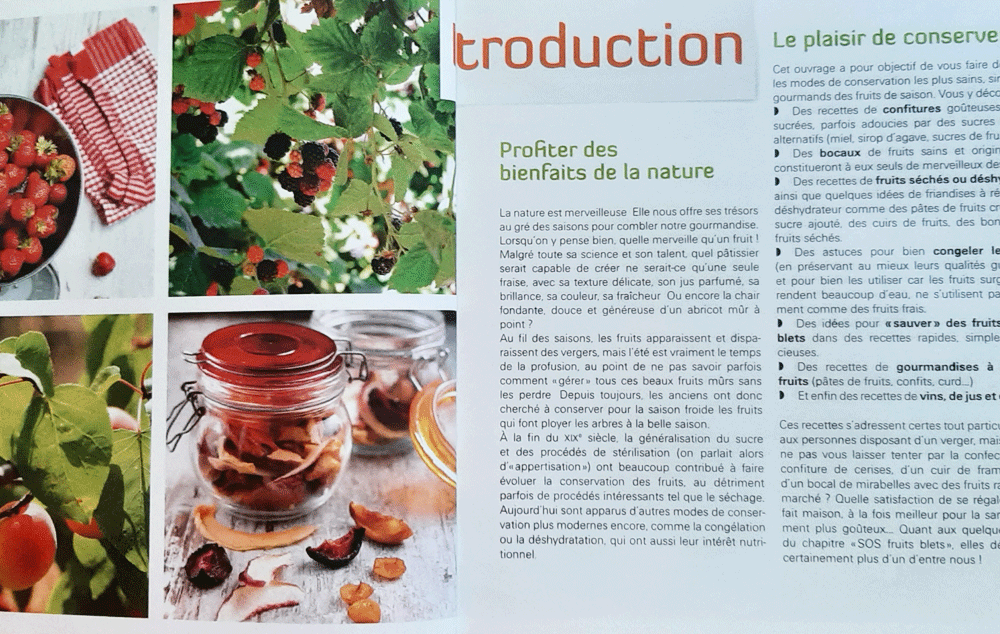 La présentation du Sommaire est agréable et on va rapidement et clairement à l’information. L’introduction fait éloge des bienfaits de la nature, le plaisir de conserver ou plutôt, se lancer dans les conserves « maison ».