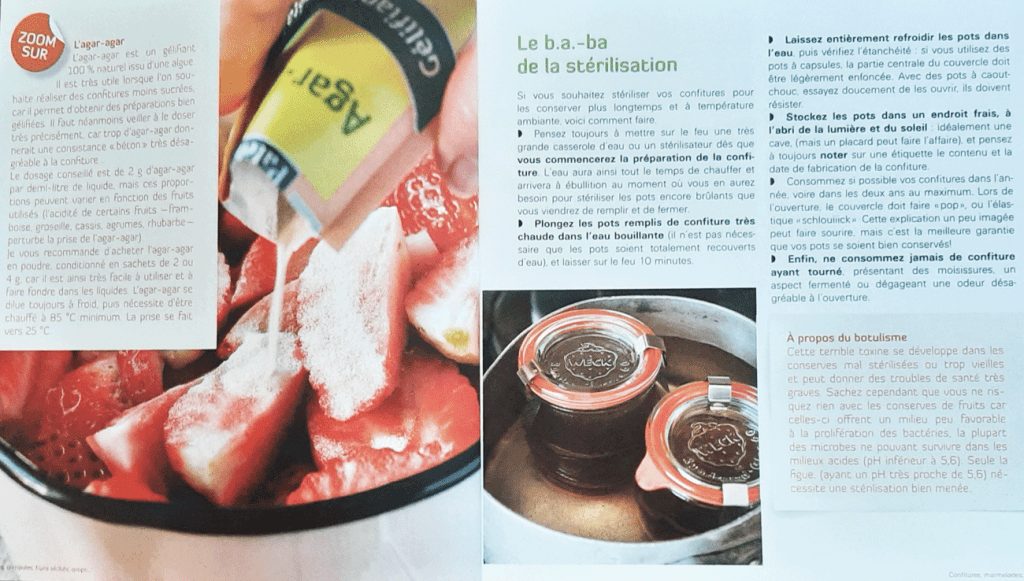 Je ne sais vous, les amis, mais en ce qui me concerne, j’appliquais déjà avant d’avoir lu cette partie de l’ouvrage le fait de déssucrer pas mal. Et je retrouve l’intention qui au coeur du paragraphe. On sucre assez souvent trop que pas assez. C’est de cela dont il est question dans les lignes de ce chapitre. Aussi, il est question d’introspection, d’ygiène devant impérativement intervenir quant à la phase de srtérilisation. Etc. J’ai bien sûr testée lagoutte de confiture dans l’assiette. Au top aussi !