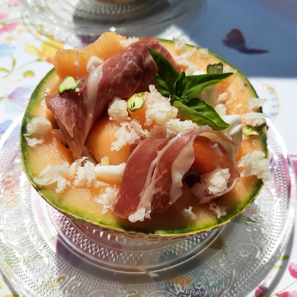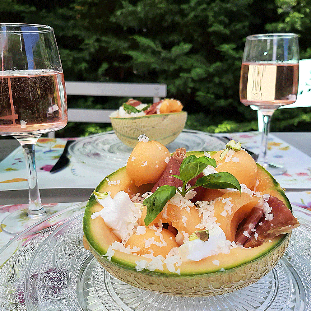Bon dimanche Muriel ! Chez nous le melon est rempli de boules de melon, d’un yaourt nature, des raisins secs, tomates, oignons, et laitue émincée en chiffonade et je parseme d’amandes éfilées.
