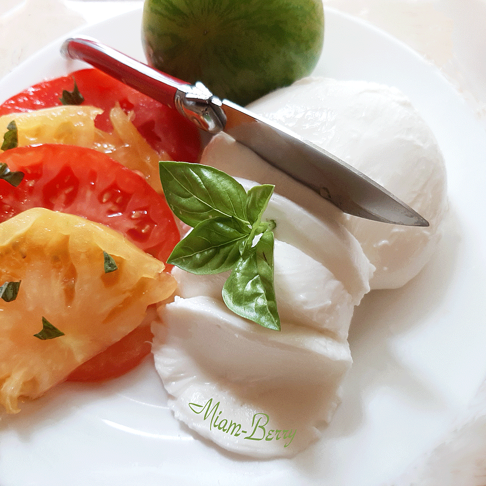 Ce lait, une fois caillé et solidifié, est découpé puis placé dans de l’eau chaude pour fusionner. La pâte est ensuite étirée et filée jusqu’à ce qu’elle devienne lisse et élastique. L’étape suivante de la découpe, « mozzata » a donné à ce fromage son nom. La pâte est détaillée en boules à la main, puis plongée dans l’eau pour être raffermie. Ainsi, le fromage est fin prêt pour faire ses preuves dans nos pizzas, nos pâtes, des entrées comme ici au melon, et rejoindre le partenaire fétiche basque et avoir formé un duo estival, sans oublier la tomate, son autre partenaire fétiche. Tomates du potager : Green, Rose de Berne et tomate jaune.