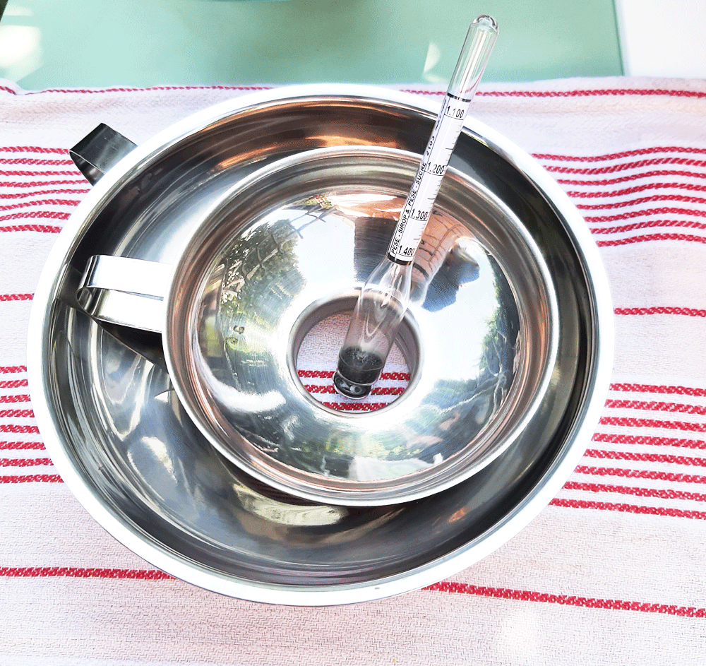 Le « truc » à sirop est en faite un pèse-sirop/ C’est au couers de la cuisson du mélange sucre, eau, obten selon les propotions conseillées, qu’il s’utilise. Ses graduations exprimes des poids en grammes, et c’est cela qui indique le stade de cuisson idéal auquelle sirop est destiné. Je vais laisser aller douement le densimètre dans le liquide, de façon à se qu’il flotte librement (mais pas immerger complètement), et lire en fonctio de la ligne de flottaison, à hauteur des yeux, sachant que chaque trait représente 10 g. Je souhaite l’essayer pour un sirop de Roses, par exemple, mais pas que ! Pour les confitues donc, à la récolte des framboise du jardin, mûres à aller chercher en balade avec mes amis cyclos (à mon retour de vacances), pommes, une gelée de coing cet automne, les figues, …