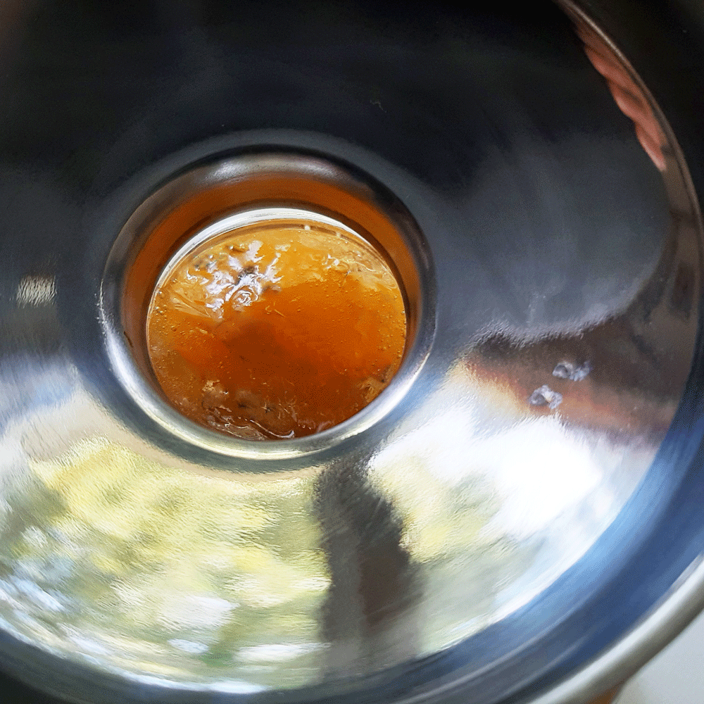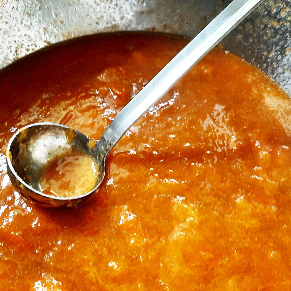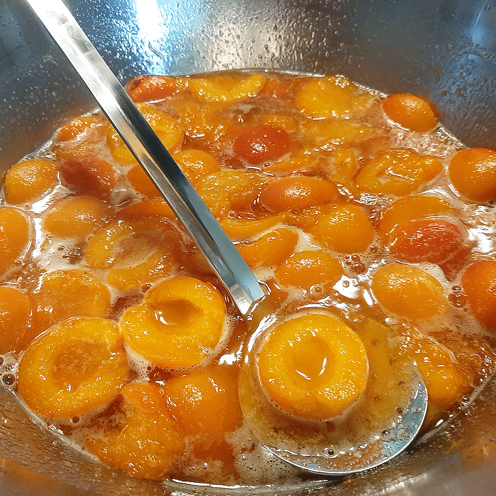 L’abricot a une douce texture, fruit savoureux ! Je n’ai pas ajouté de noyaux, ni amandes à cette recette. Très inspirée et heureuse de faire ! Après les deux précédentes étapes, j’ai trouvée une alternative au versement de la confiture : j’ai stérélisé le verseur à jus de fruit, ici d’une praticité exemplaire, pour couler, en oeuvrant au propre. la confiture dans les pots, via l’antonnoir.