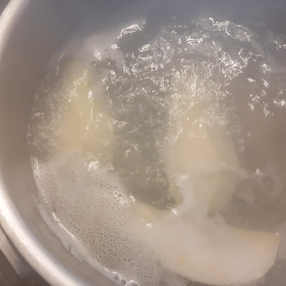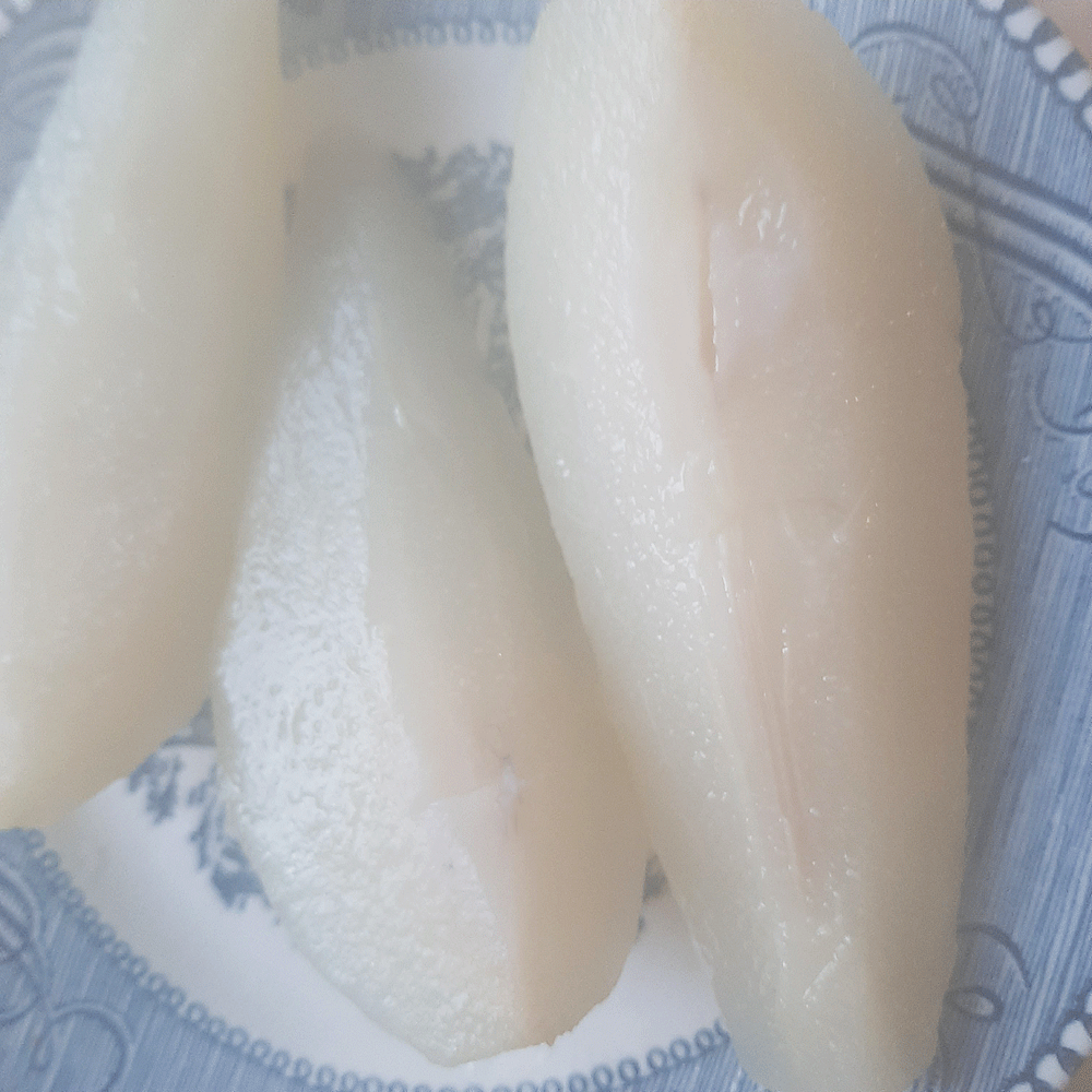 - Dans une casserole, pocher la demi-poire en quartiers, après l’avoir épluchée et épépinée.