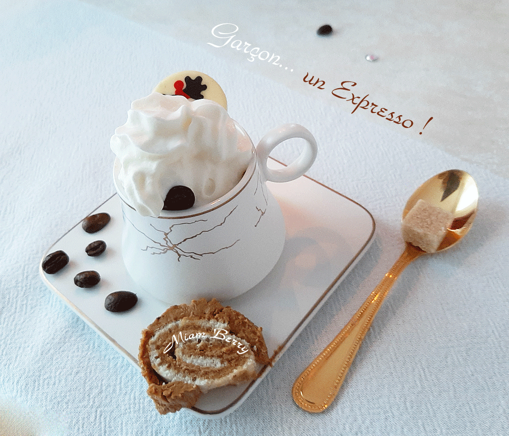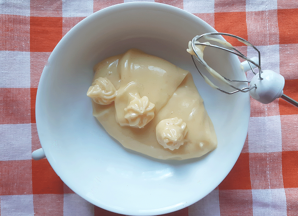 Avec le fouet de l’appareil, j’ai montée une chantilly maison juste pour la valeur des tasses : crème fleurette/entière. Puis comme d’hab, chantilly dans une poche à douille. Il en faut vraiment peu pour des tasses expresso de 80 ml par exemple.