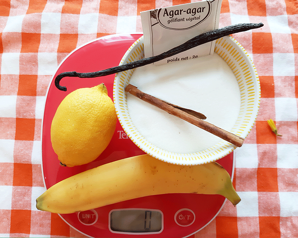 • 500 g de sucre & 2 g. d’Agar – agar : selon moi suffisant, la banane est déjà sucrée d’elle-même