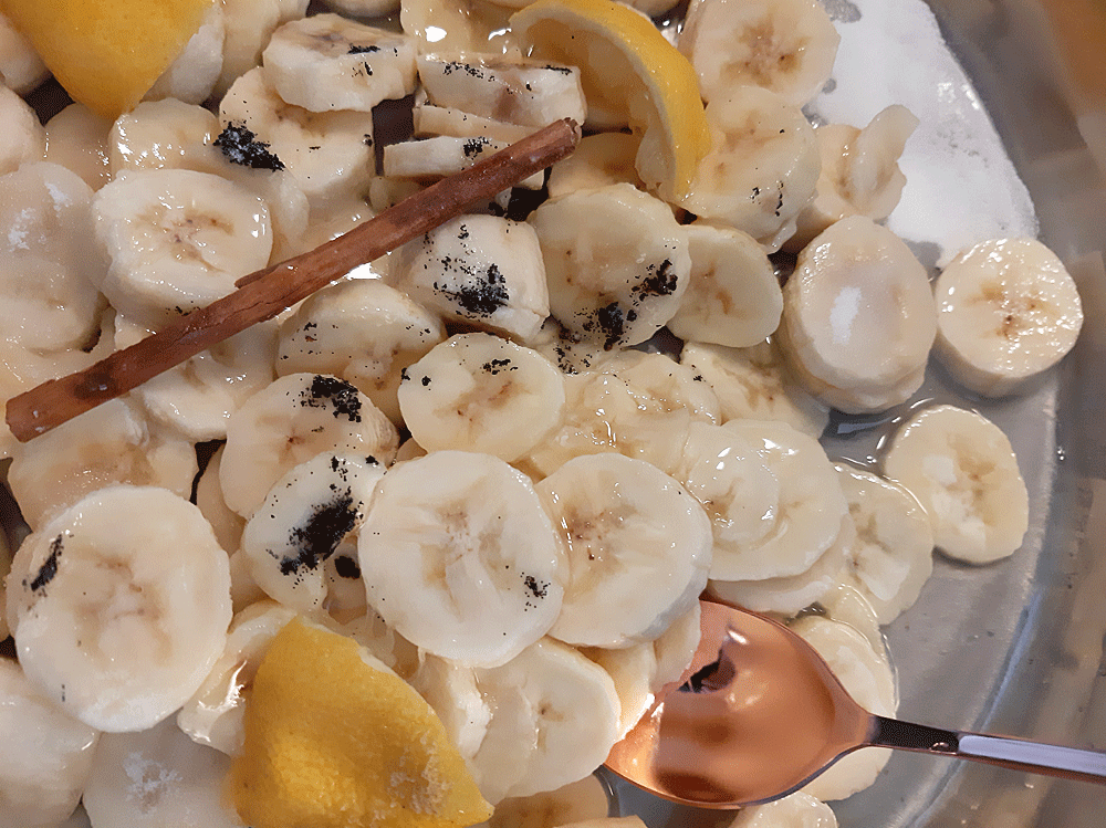 Après avoir disposé bananes, citron, gousse de vanille grattée puis la cannelle, je fis cuire à feu doux (a vite fait d’attacher au fond : surveiller souvent) un peu plus d’une vingtaine de mn. En effet, je préférais baisser le feu davantage et cuire quelques minutes supplémentaires.