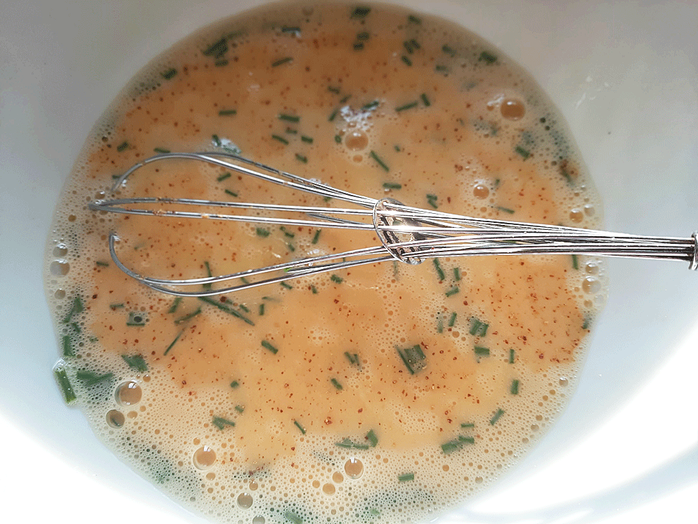 1 Dans un saladier, casser et battre les œufs entiers. Salez, poivrez ou, selon votre convenance, remplacez le poivre par le Piment d’Espelette. Ciselez la ciboulette et bien tout mélanger.